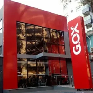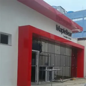 Estruturas verticais com informações e identidade visual da marca, usadas em entradas ou áreas externas.